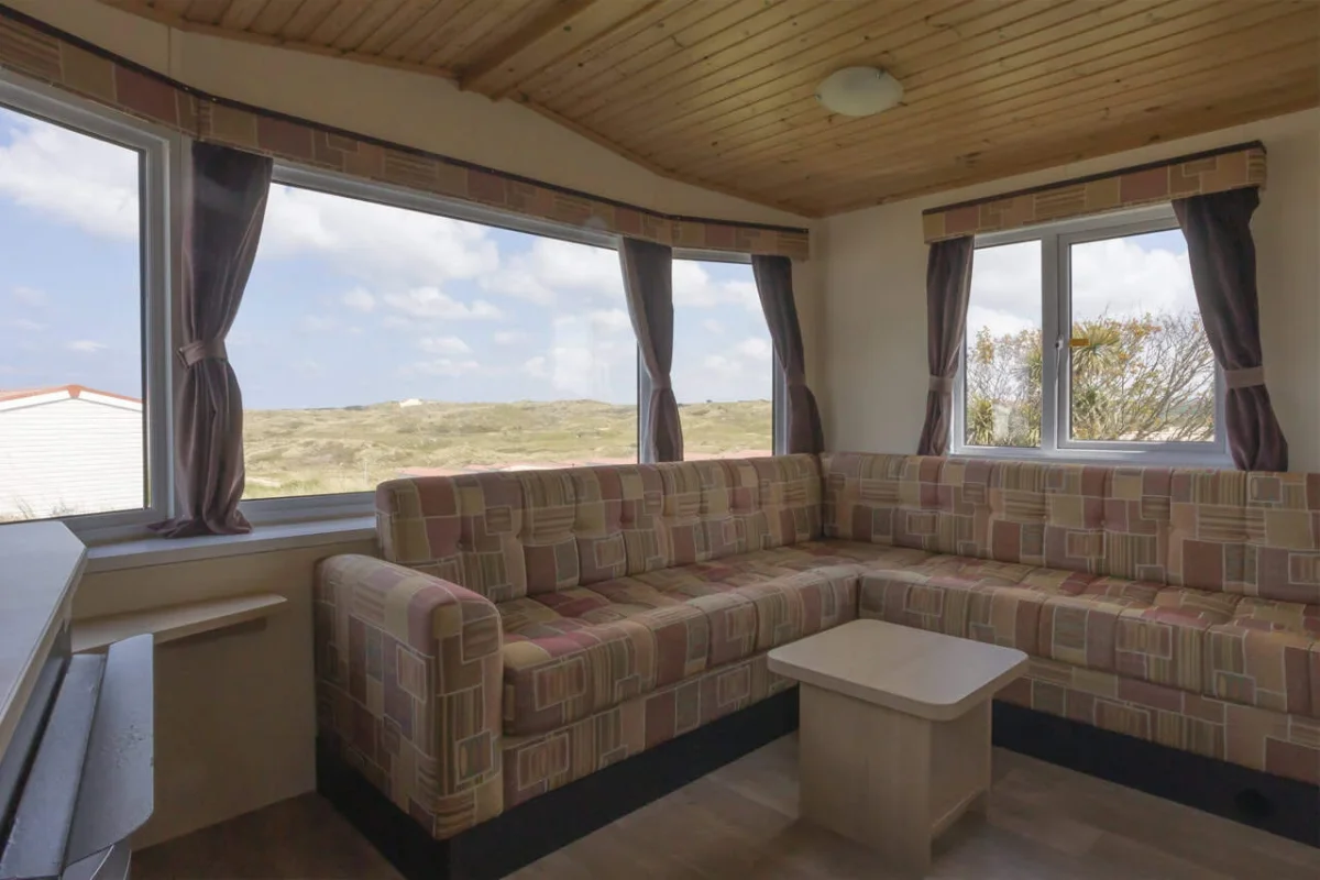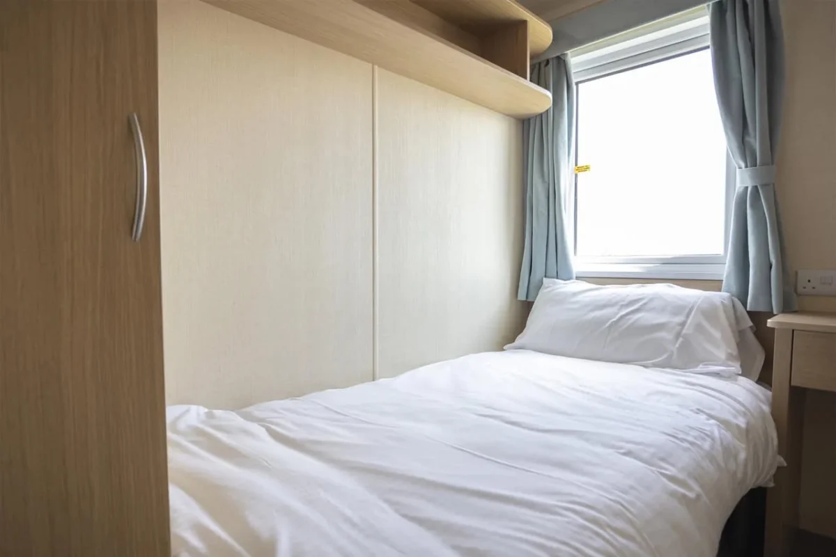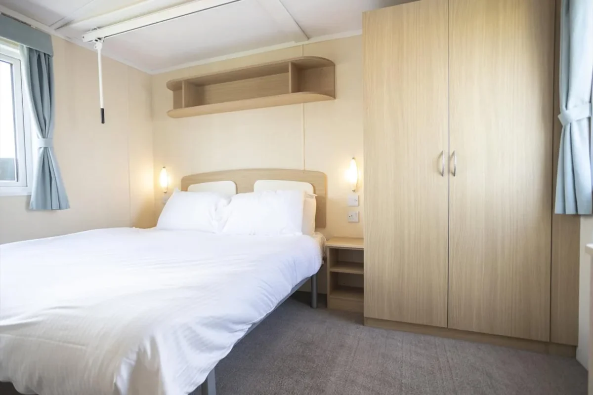 The caravan is accessed via a step-free ramped entrance. Parking is located nearby, with level pathways providing access around the resort and to shared facilities.
