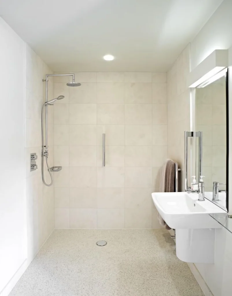 The wet room includes a step-free wheel-in shower with handheld attachment, handrails, wheel-under wash basin, lever taps, and WC with side transfer space.