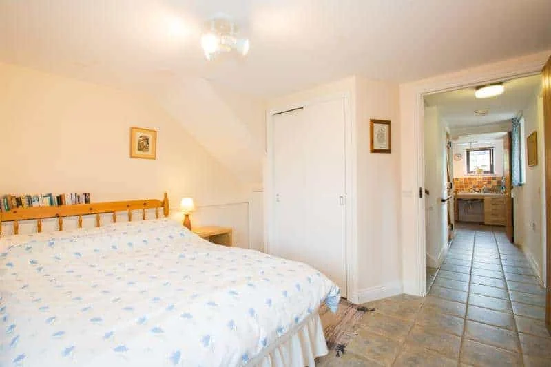 The main double bedroom is on the ground floor and is fully step free. It offers generous circulation space around the bed and has wider doorways, making it suitable for wheelchair users and guests with mobility equipment. The room also provides direct access to the parking area.