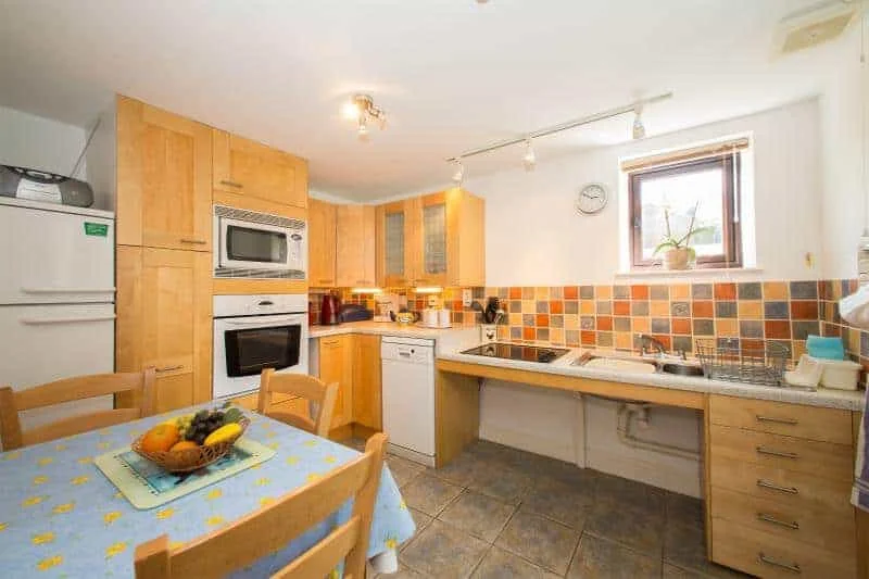 The kitchen is located on the ground floor and includes wheel under counters and a mid height oven, allowing it to be used from a seated or standing position. Key appliances and preparation areas are positioned within comfortable reach.