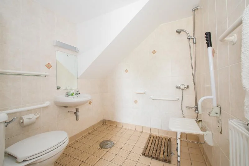 The ground floor wet room includes a wheel in shower, shower seat, supportive grab rails, and a wheel under wash basin, allowing for safer and more comfortable washing and transfers.
