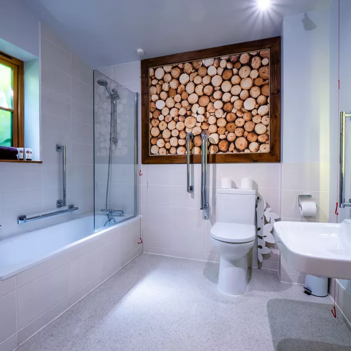 The ground floor bathroom includes step free access and features designed to support guests with reduced mobility, including a wheel under wash basin and supportive handrails.