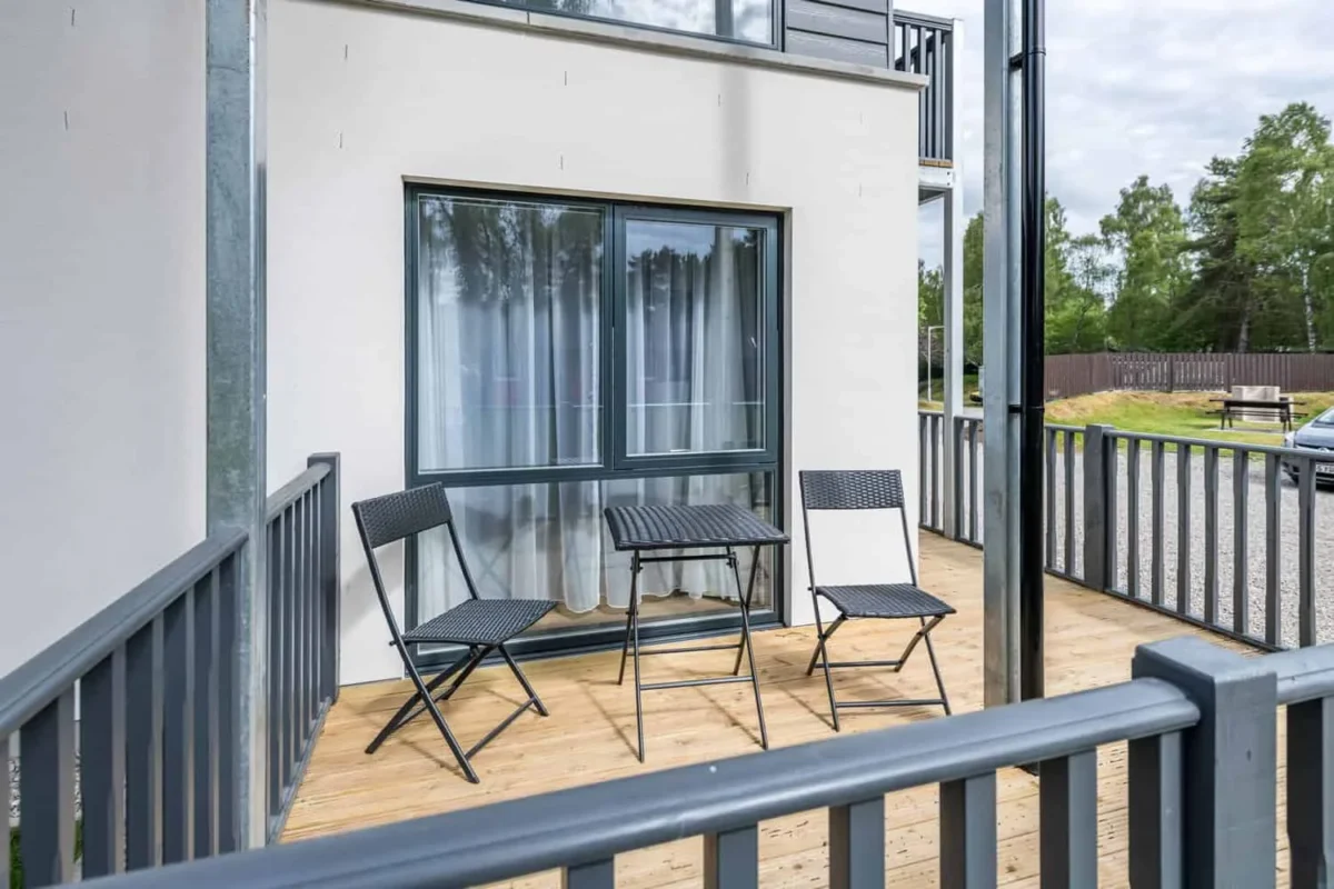 The private decking area is accessed via level thresholds from the living area, allowing guests to enjoy the outdoor seating and surrounding grounds.