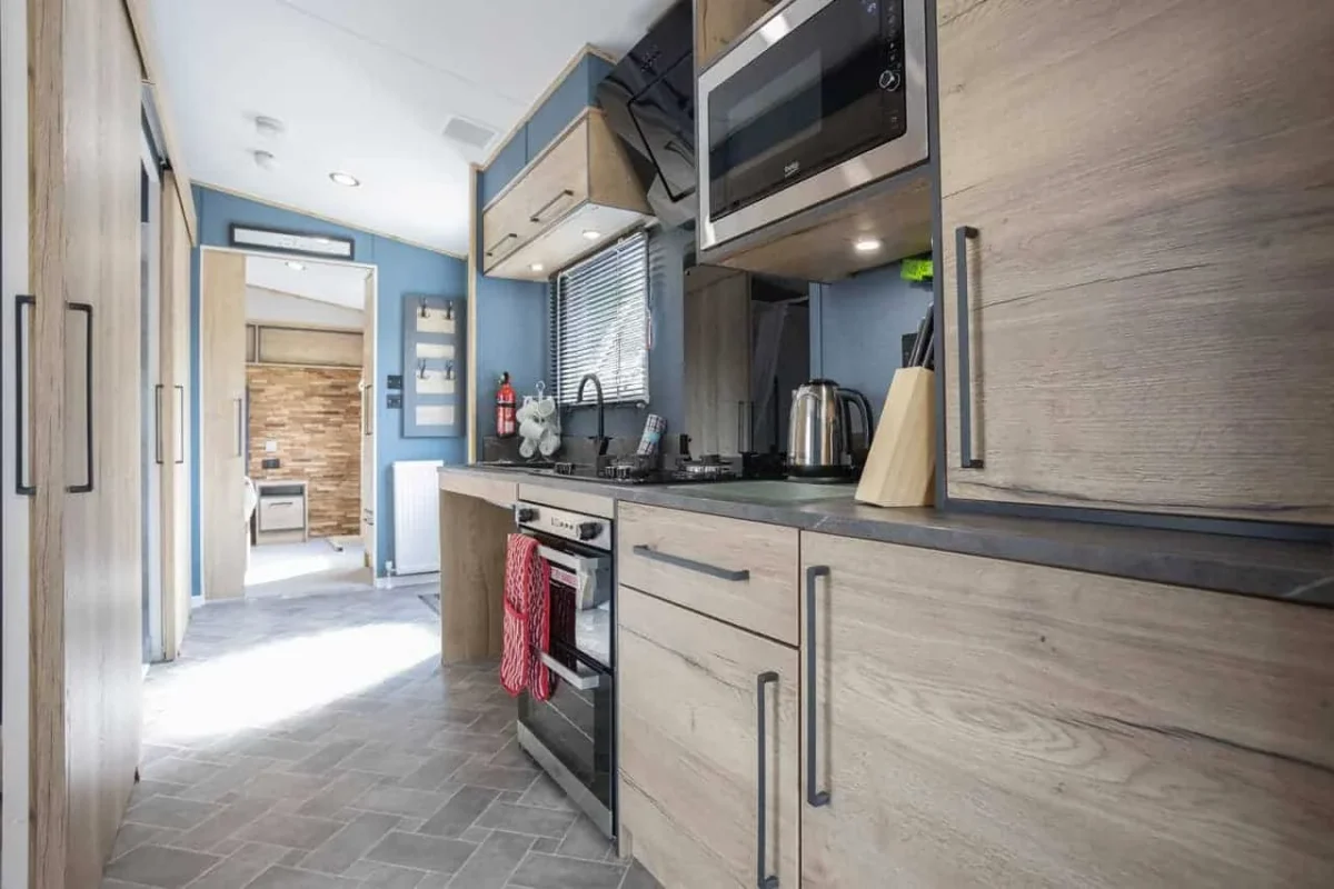 The caravan is single storey with step free access via a ramped entrance. Level internal flooring allows easy movement between the living area, bedrooms, kitchen, and bathroom.