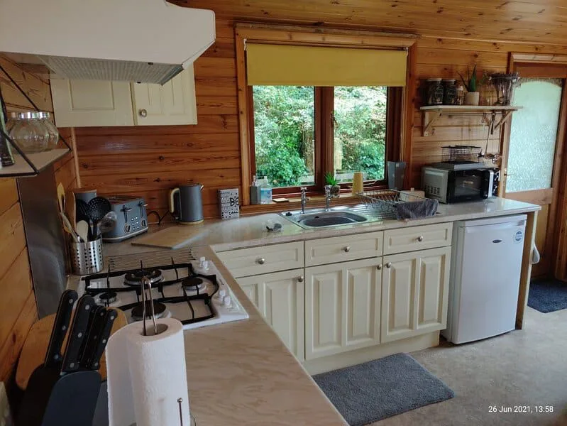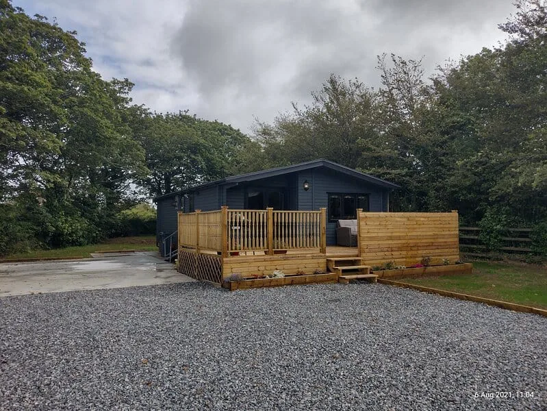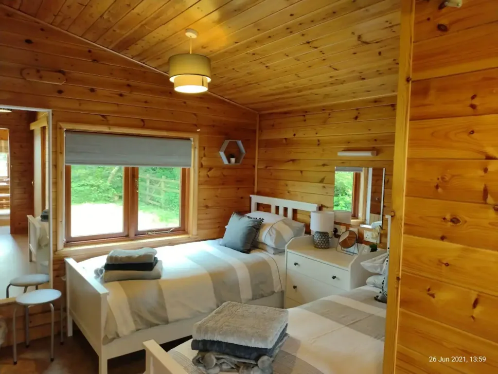 The lodge includes two bedrooms. The twin bedroom is designed with accessibility in mind and includes an ensuite bathroom. The second bedroom is a double room, offering a comfortable space for additional guests or carers.