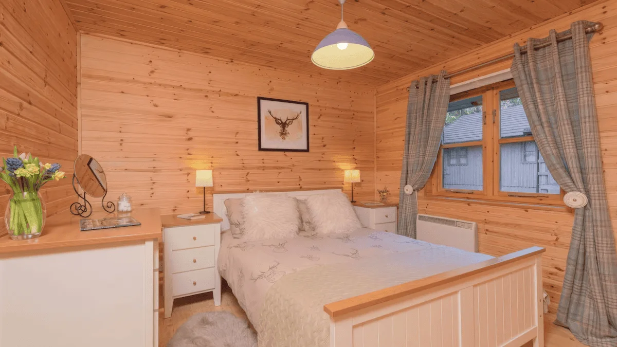 The lodge includes three bedrooms. One double bedroom includes an ensuite shower room. The second bedroom is a twin with two single beds, and the third is a twin room with a bunk bed, suitable for children or additional guests. Space within the bedrooms supports comfortable use for guests with reduced mobility.