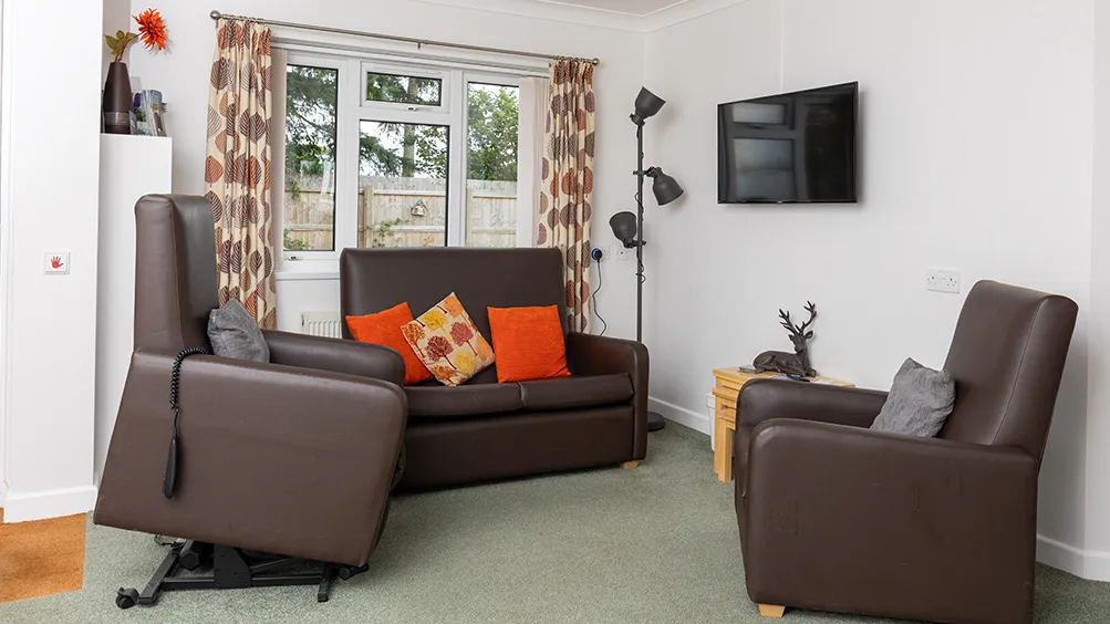 The open plan lounge includes a riser recliner chair, a firm armchair and a two seat sofa, arranged to allow flexible wheelchair positioning. A dining table seats four guests. The space includes a Smart TV with Chromecast and Netflix, free WiFi and central heating.