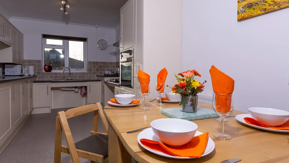 The kitchen is fully wheelchair friendly with split level worktops and units. Appliances include an oven, hob, microwave, dishwasher, washing machine and fridge with freezer compartment. All cookware, utensils, cutlery and crockery are provided, and the layout allows meal preparation from a seated position.