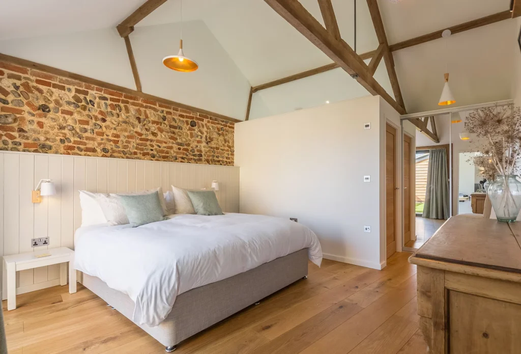 The barn includes two bedrooms, both designed to allow ease of movement. The first bedroom features a super king size bed, clear space around the bed and direct access to a private patio via French doors. The second bedroom offers a flexible super king or twin configuration, allowing the layout to suit different guest needs.