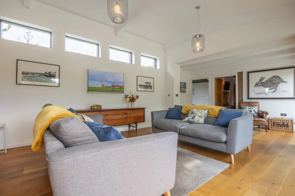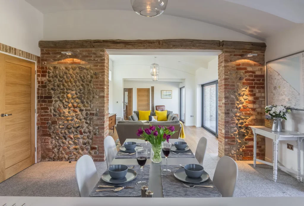 Outside, the barn includes a fully enclosed south west facing courtyard patio suitable for outdoor dining, as well as a large enclosed lawn area. These outdoor spaces provide a safe environment for relaxation, children or dogs.