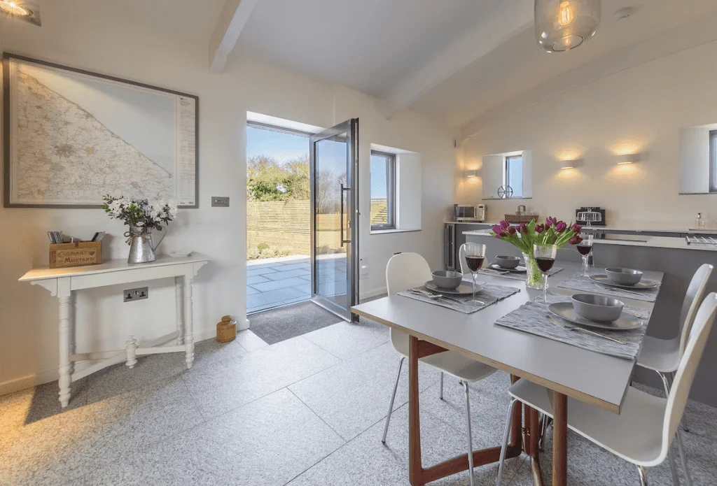 The open plan living space is fully step free and designed to allow smooth movement between the seating, dining and kitchen areas. The kitchen includes modern appliances arranged for practical use from a standing or seated position. The dining table allows flexible positioning for guests with limited mobility. French doors provide level access to the courtyard patio.
