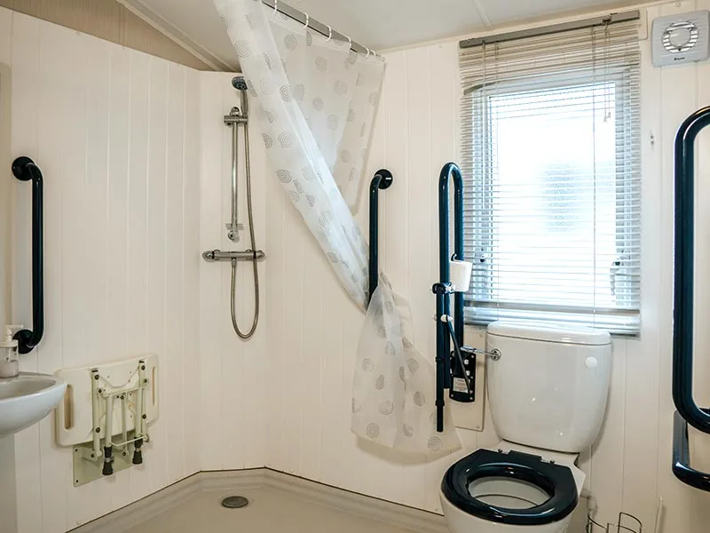 The property includes a wheelchair-friendly wet room with a step-free, wheel-in shower. A wall-mounted shower seat, handheld shower head, grab rails, and lever-style fittings are provided. The toilet offers side transfer space.