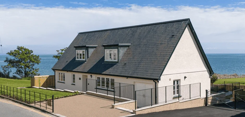The property benefits from step-free, level entry. Parking is available for two cars, with accessible pathways leading to the entrance, patio area, and onward routes to the Coast Path.