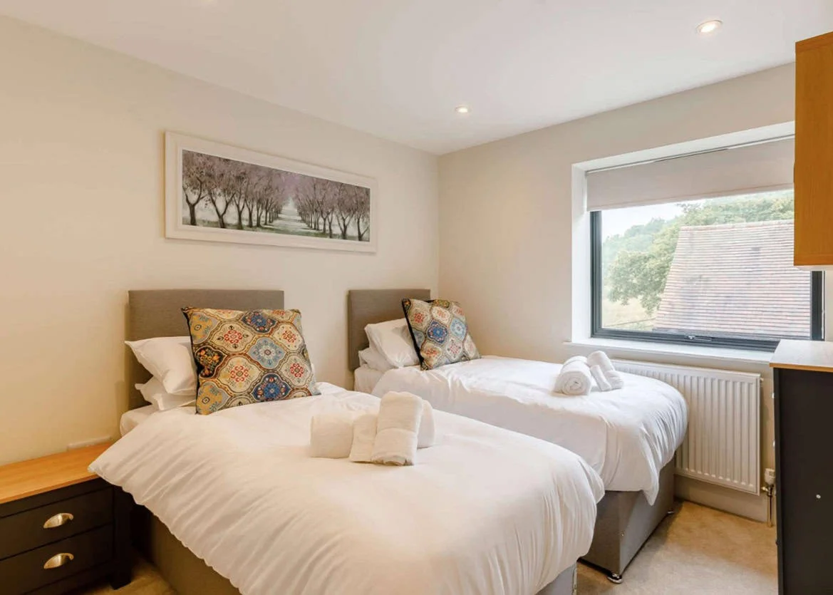 The cottage includes three first-floor bedrooms. One bedroom is equipped with a profiling bed with optional side rails and a ceiling-mounted track hoist rated to 146 kg. Bed configurations across the property are flexible, allowing rooms to be arranged as twins or doubles where required. There is ample transfer space beside beds, and additional safety equipment such as bed bumpers can be hired.