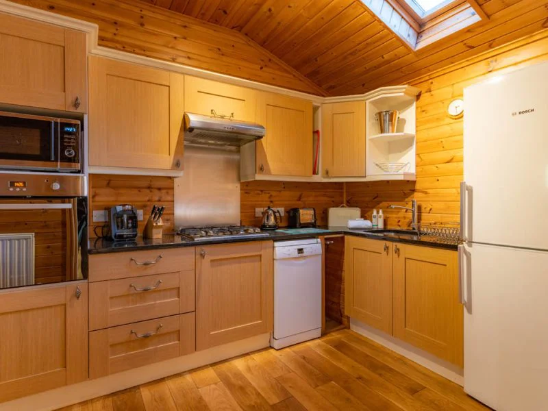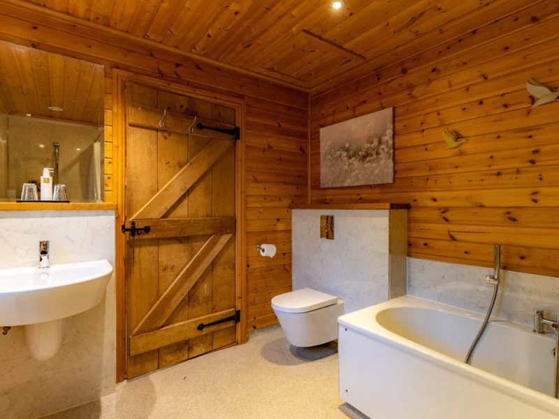 Welcome to Fieldfare Lodge, a tranquil and wheelchair friendly holiday lodge for two set within the peaceful woodlands of The Tranquil Otter in Thurstonfield, Cumbria. Designed with accessibility at its heart, Fieldfare Lodge combines cosy interiors with beautiful lake views, creating an inclusive and relaxing retreat in the heart of nature near Carlisle and the Lake District. The lodge is fully wheelchair accessible and arranged on one level, with ramped access leading directly into the open-plan living area. Inside, a reclining sofa provides a comfortable space to unwind, while large windows open out to the decking area overlooking the lake. A log burner on a raised stone hearth adds warmth and character, creating a truly inviting space for peaceful evenings. The kitchen is designed for convenience, with accessible appliances including a mid-height oven and clear workspace. The freestanding dining table allows for flexible use, ensuring comfort for every guest. The spacious bedroom features a super king-size bed with plenty of room on both sides for wheelchair access. The adjoining bathroom offers both a step-free shower and a bath with handheld shower, complemented by a lever-style tap and ample transfer space beside the toilet to support safe and easy use. Outside, the rear decking area provides a fully accessible outdoor space, complete with a sunken hot tub and seating for al fresco dining surrounded by woodland views. A ramped path connects the lodge to the parking area, and two gentle steps lead down from the decking to a grassy BBQ area beside the lake, ideal for lazy afternoons outdoors. With on-site parking, assistance dogs welcome, and excellent local amenities, Fieldfare Lodge offers a seamless combination of comfort and accessibility. Several pubs and restaurants are nearby, including The Royal Oak, just five minutes away by car. If you are looking for a luxury accessible holiday in Cumbria or a disabled friendly lodge near the Lake District, Fieldfare Lodge provides everything you need for a peaceful, inclusive, and restorative stay surrounded by nature.