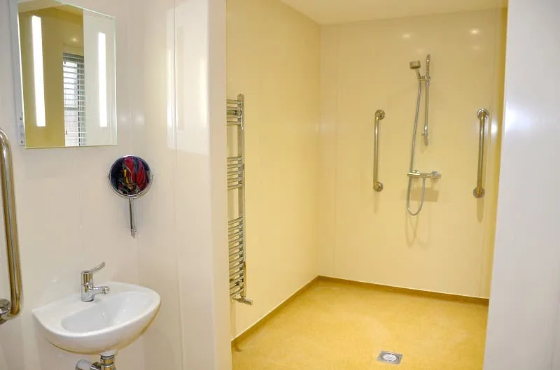 The accessible wet room includes a step-free, wheel-in shower with handheld shower head, grab rails, wheel-under wash basin, WC with transfer space to the side, personal alarm, and level flooring throughout. Optional specialist shower seating is available.