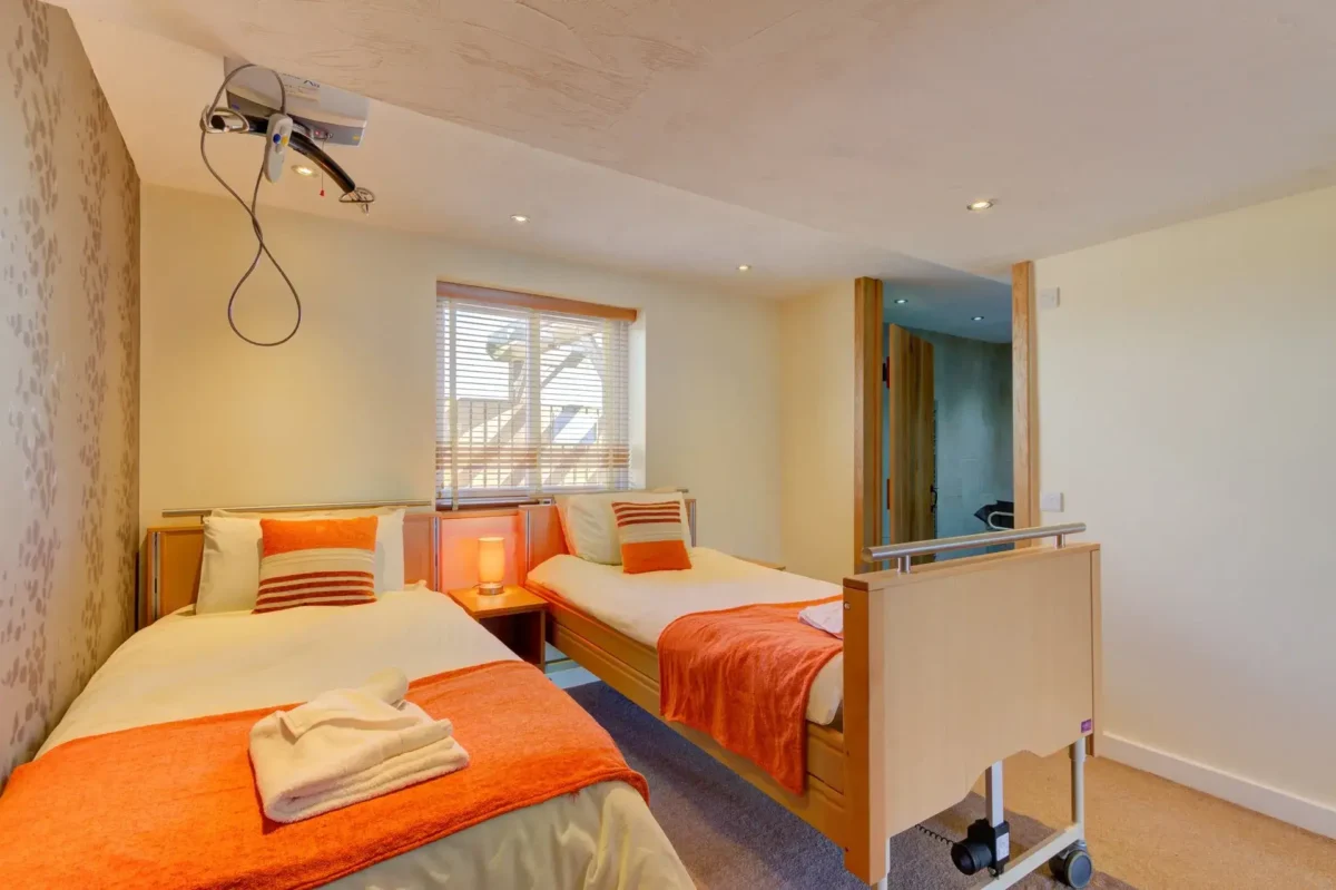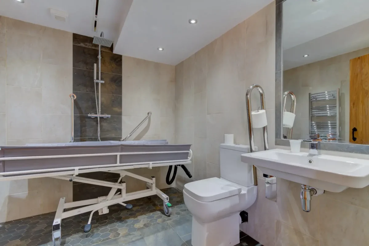 One ground floor bedroom is fully adapted and includes an electric profiling bed alongside a twin bed, allowing flexible sleeping arrangements for guests and carers. A ceiling track hoist provides smooth transfers between the bedroom and the adjacent accessible wet room. The wet room includes a roll-in shower, grab rails and accessible fixtures to support safe and independent use.