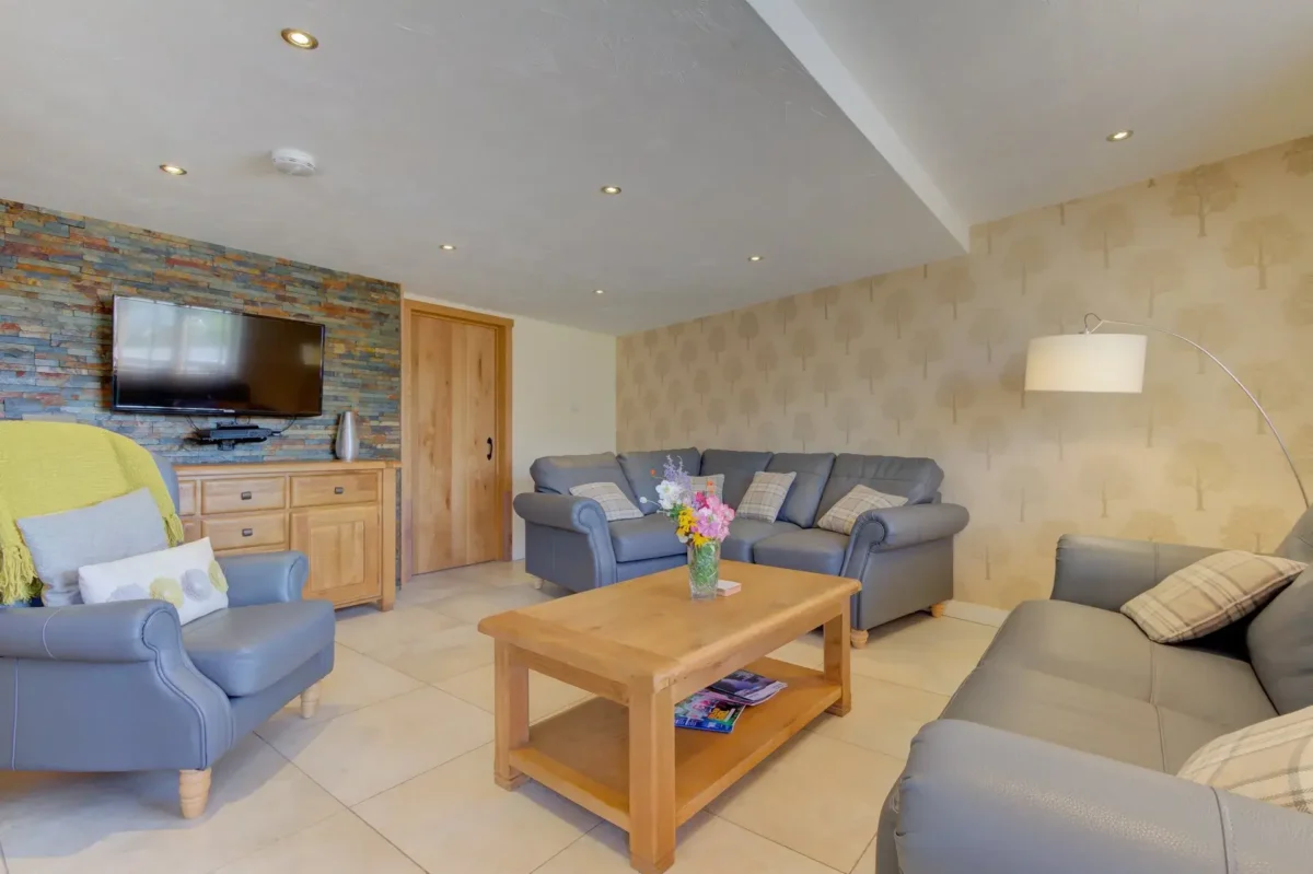The private decking area is fully accessible and includes outdoor seating and a hot tub. The outdoor space allows guests to relax and enjoy the countryside surroundings.
