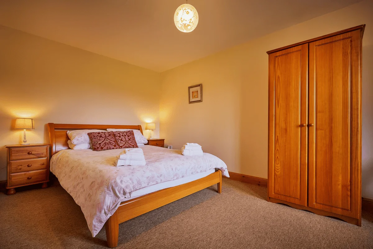 The ground floor king-size bedroom provides more than 1 metre of transfer space beside the bed and sufficient manoeuvring space for wheelchair users. Two additional bedrooms are located upstairs.