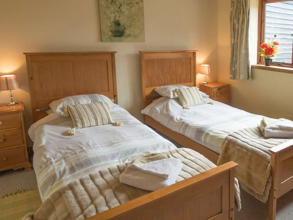The ground floor twin bedroom provides more than 1 metre of transfer space beside the beds and sufficient manoeuvring space for wheelchair users. Two additional bedrooms are located upstairs.