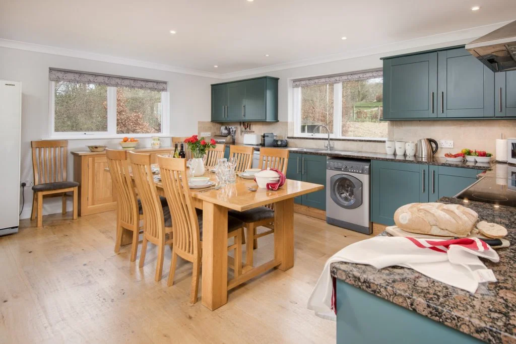The contemporary kitchen features granite worktops, a large American style fridge freezer, dishwasher, washer dryer, and everything needed for relaxed self catering. The oak dining table seats ten, creating the perfect space for shared meals. In the separate living room, floor to ceiling windows frame stunning countryside views. Guests can relax in front of the log burning stove or enjoy a film on the large Smart TV. Doors open directly from the living room onto a private sandstone terrace and garden.