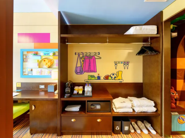 The Accessible Lego Friends Room offers flexible sleeping arrangements, including a comfortable double bed, a cheerful bunk bed, and a pull-out trundle bed, making it ideal for families with children. The separate children’s sleeping area creates a fun sense of independence for young guests while keeping everyone close by. Wide circulation space, level flooring, and carefully planned layout make the room easy to navigate for wheelchair users.