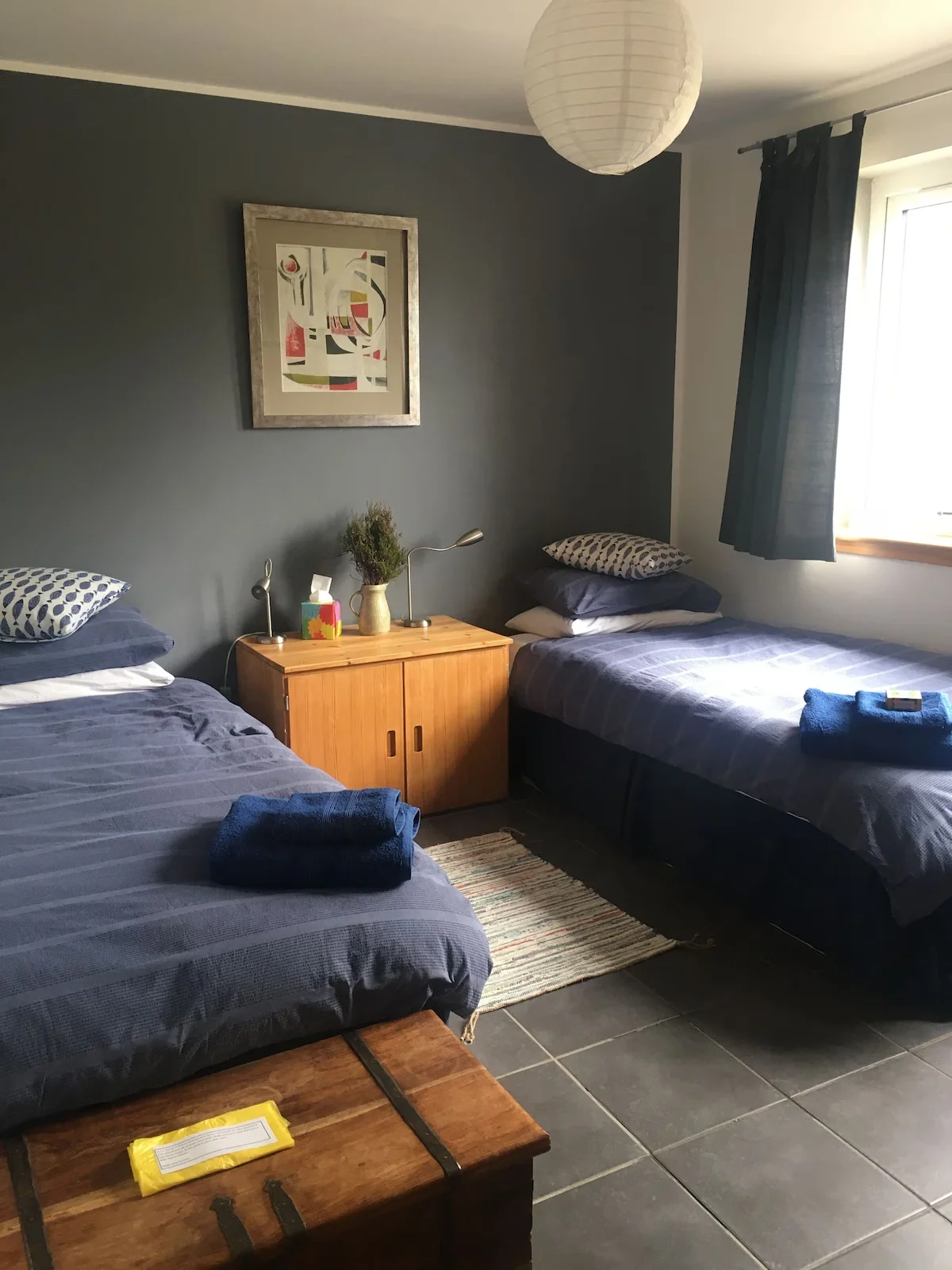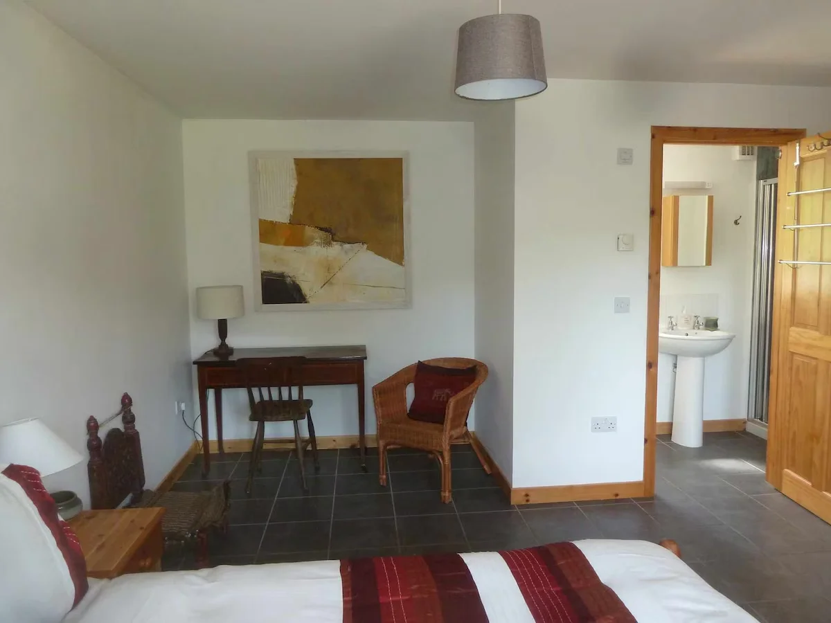 A ground floor king size bedroom offers transfer space exceeding one metre beside the bed and includes an ensuite wet room. A second flexible bedroom is also located on the ground floor. A third bedroom is located upstairs for guests comfortable using stairs.