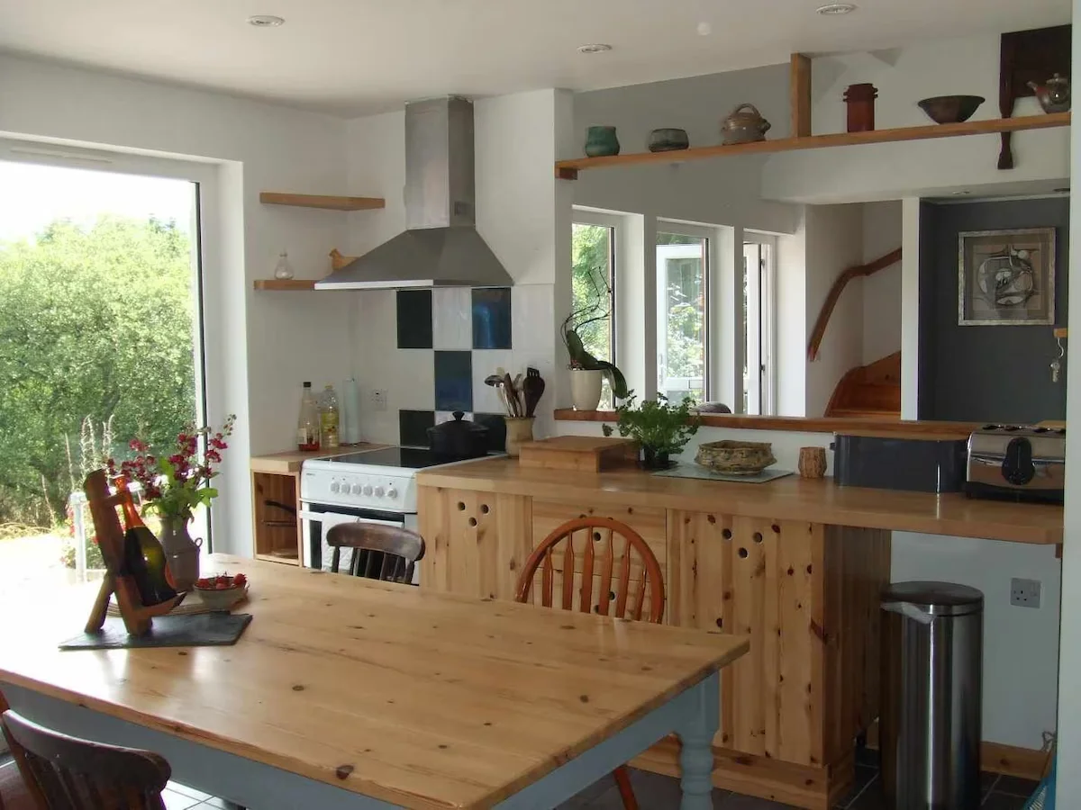The kitchen is fully equipped and arranged within the open plan layout, allowing easy movement between preparation, dining, and seating areas.
