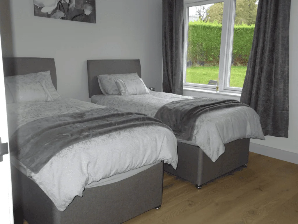 Both bedrooms are located on the ground floor and provide more than 1 metre of transfer space beside the beds, making them suitable for guests with limited mobility.