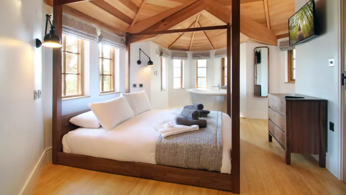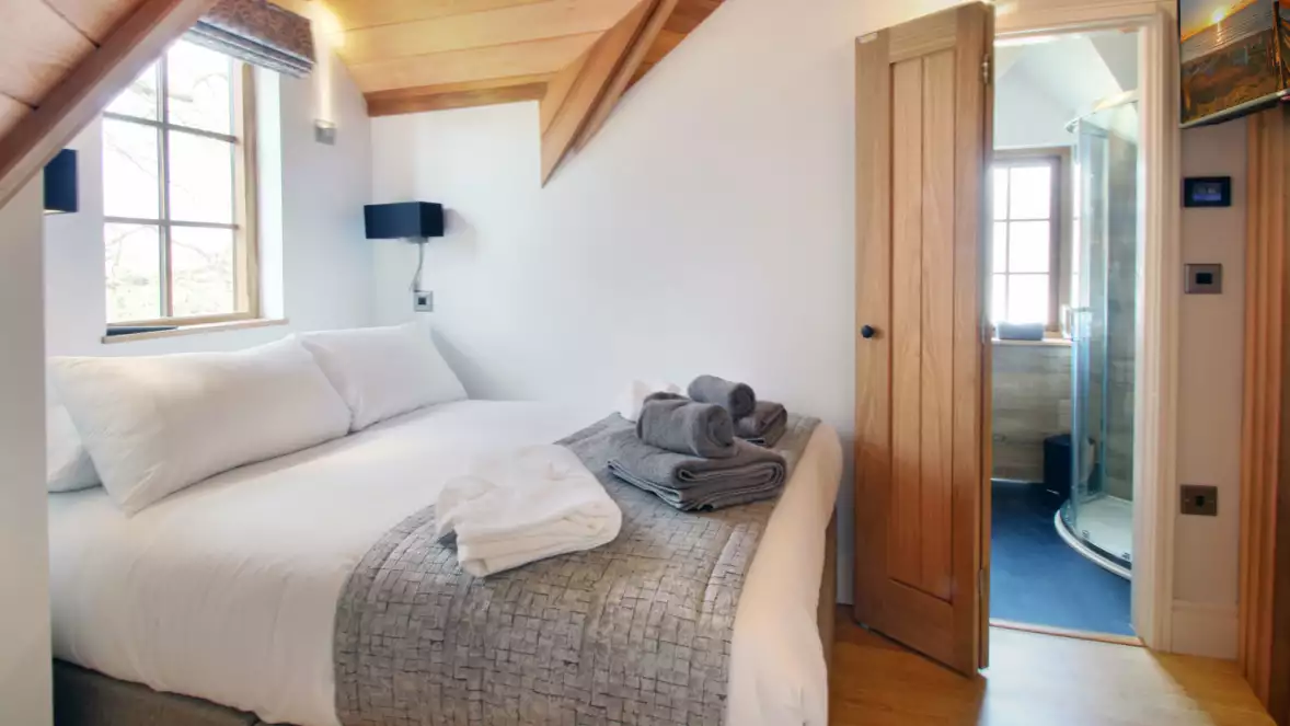 The ground-floor bedroom includes an ensuite bathroom with a separate shower and bath. The shower provides step-free access and includes a handheld shower head. Additional bathrooms are located within the upstairs bedrooms.