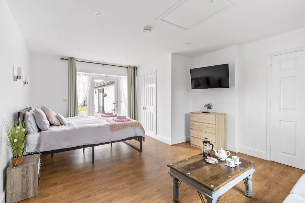The bedroom includes a non-profiling double bed with more than 1 metre of clear transfer space beside the bed, allowing comfortable access for guests with mobility needs.