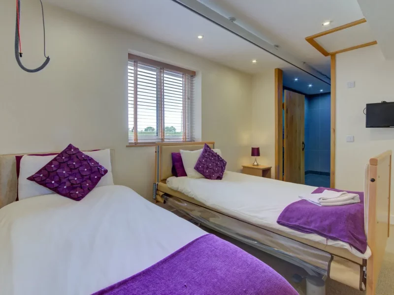 One ground floor bedroom is fully accessible and includes a profiling bed alongside a twin bed. A ceiling track hoist is installed to support transfers. This bedroom has direct access to a fully accessible wet room with a step free shower, grab rails and a wheel under wash basin. Optional equipment such as a shower chair, commode chair or shower bed is available on loan.