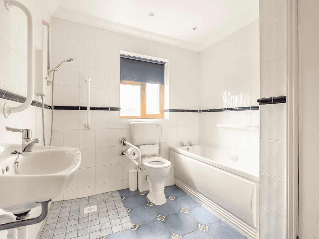 The accessible wet room includes a step free wheel-in shower with handheld attachment, wall-mounted shower seat, handrails, wheel-under wash basin, and toilet with side transfer space. A bath with grab rail is also available.