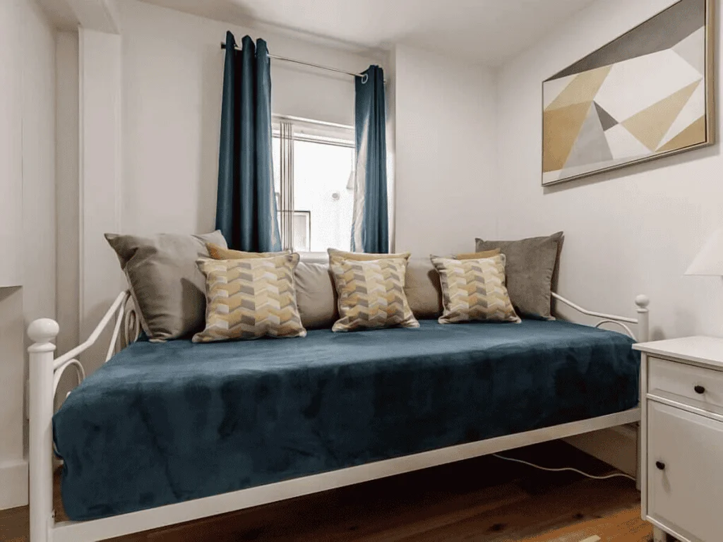 One bedroom is located on the ground floor, offering clear transfer space of more than one metre beside the bed. Four additional bedrooms are located on the first floor and are accessed via stairs.