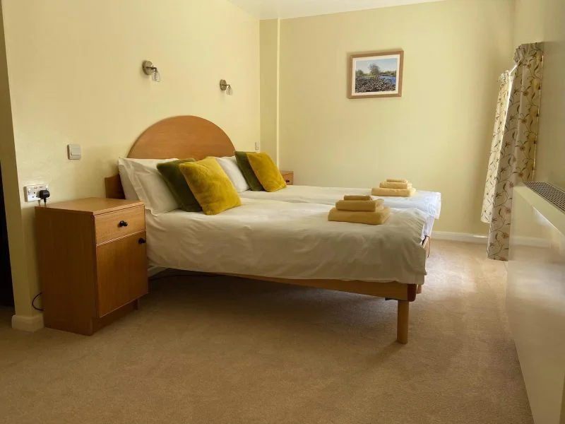 The bedroom is located on the first floor and is accessed using the stairlift. Beds can be arranged as either a double or twin configuration, with generous space beside or between the beds to support wheelchair transfers and mobility aids. Handrails are present to provide additional support.