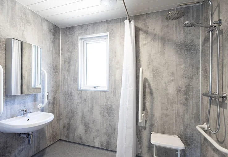The wet room includes a step free wheel-in shower, fixed shower seat, handrails, wheel-under wash basin, and WC with transfer space on both sides.