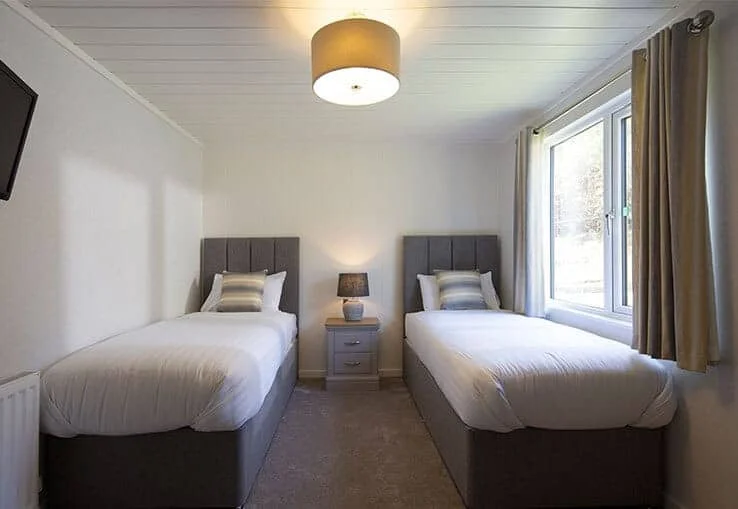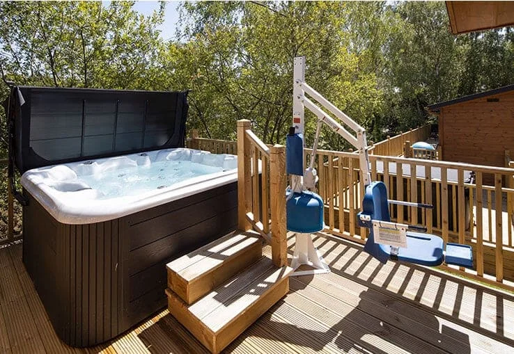 Level routes connect the lodge to the surrounding park pathways. The private hot tub is equipped with a hoist to support inclusive access. Shared outdoor areas and facilities are accessed via park-managed routes.