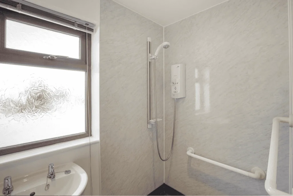 The wet room includes a step free wheel-in shower with handheld attachment, handrails beside the shower and toilet, wash basin with lever-style taps, and level flooring throughout.