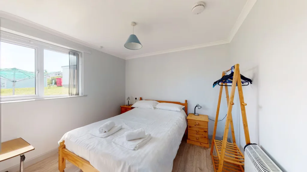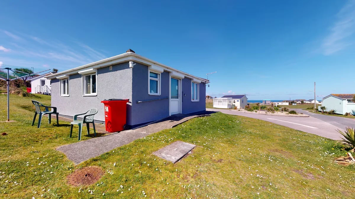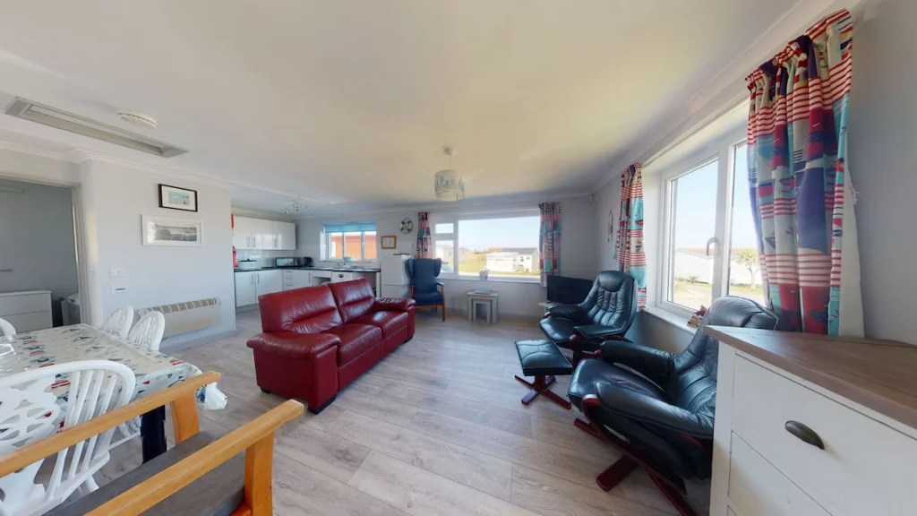 The chalet benefits from level external access to a lawned area and hardstanding paths that connect to shared park facilities, eateries, and beach routes.
