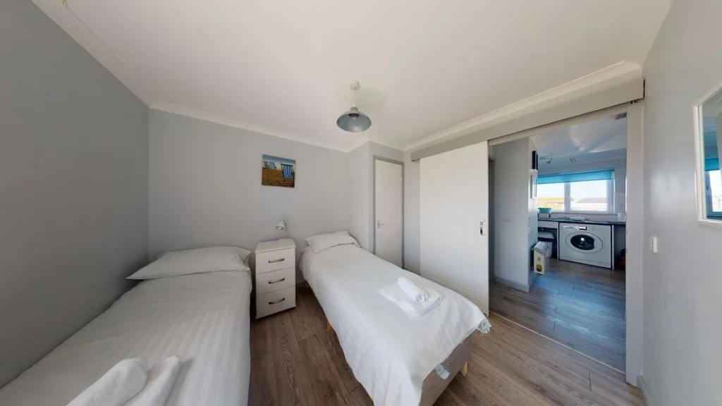 All bedrooms are located on the ground floor and include a double bedroom, a twin bedroom, and a smaller single cabin room. Transfer space of more than one metre is available beside the main beds.