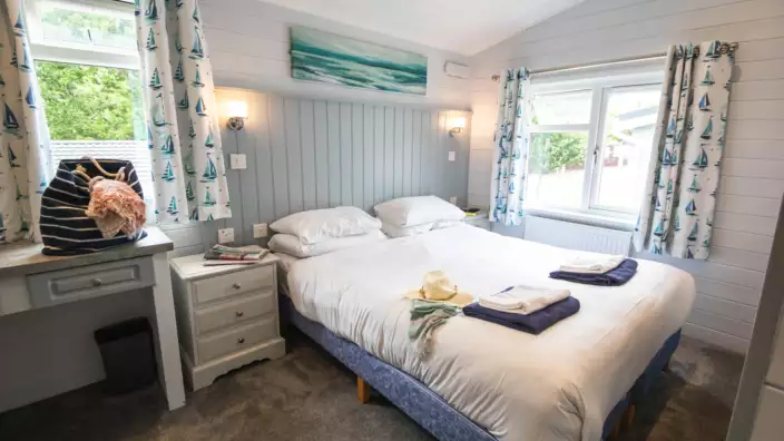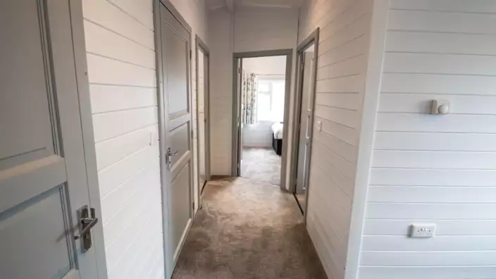 The lodge includes three bedrooms arranged on the same level as the main living areas. One bedroom includes bunk beds, while the remaining bedrooms offer flexible sleeping arrangements suitable for families or carers. Transfer space beside the bed is available to support accessible use.