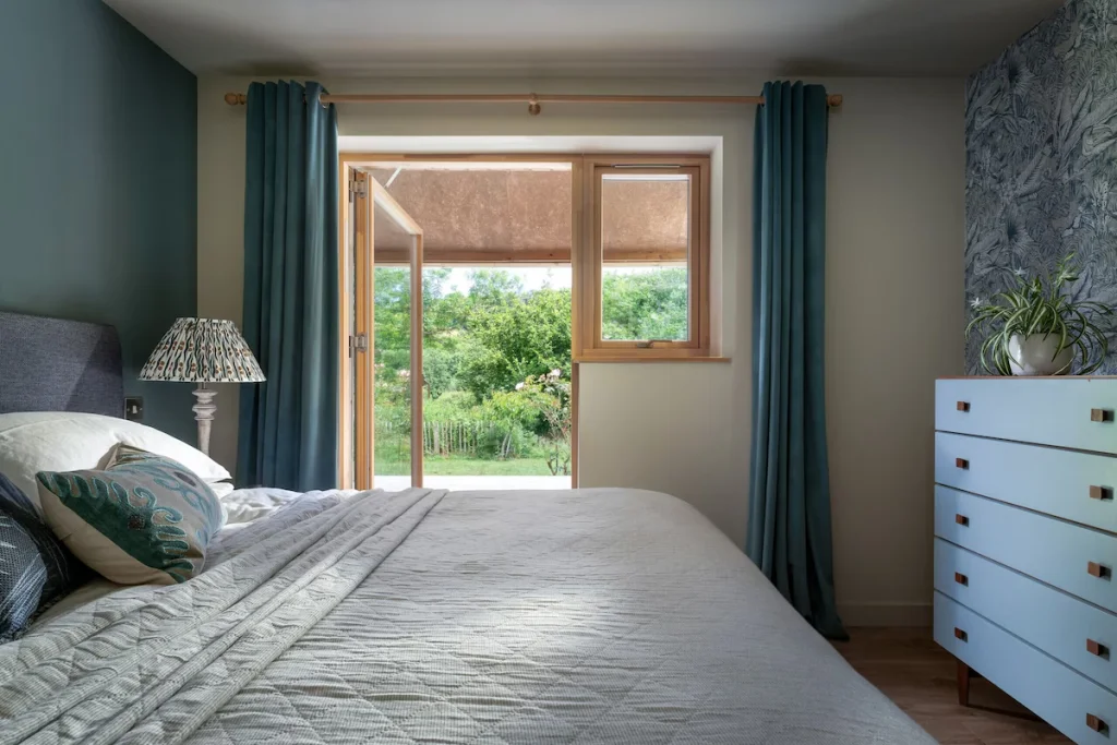 Two bedrooms are located on the ground floor and offer double or twin bed configurations. More than one metre of clear transfer space is available beside and at the foot of the beds. An additional mezzanine sleeping area with a double futon is accessed via stairs.