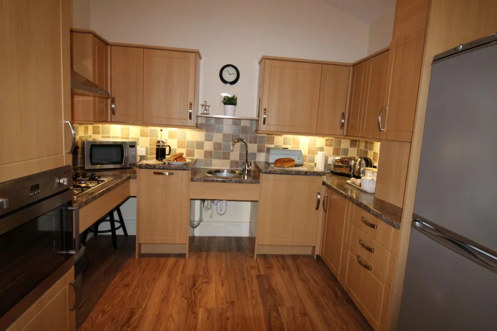 The kitchen is designed to support accessible use and offers clear floor space for manoeuvring. Work areas and appliances are positioned for ease of use by guests with limited mobility.