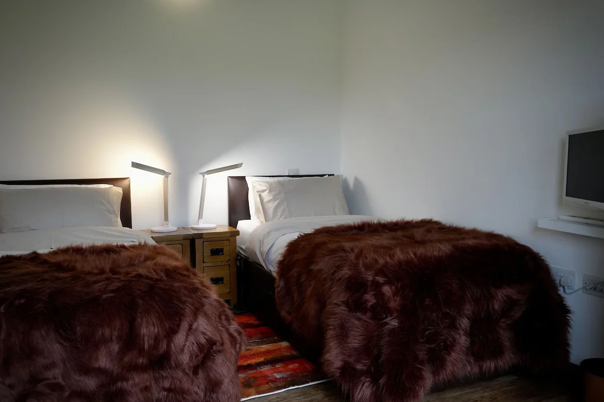 One bedroom is located on the ground floor and can be arranged as a super-king or twin beds. More than one metre of clear transfer space is available beside the bed. Two additional bedrooms are located on the first floor and are accessed via stairs.