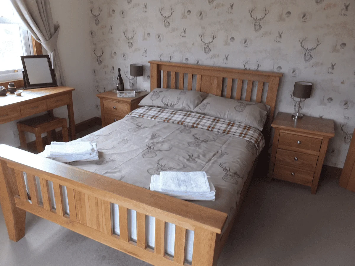 One bedroom is located on the ground floor and arranged as a twin, positioned close to the accessible wet room. More than one metre of clear transfer space is available beside the beds. Three additional bedrooms are located on the first floor and are accessed via stairs.