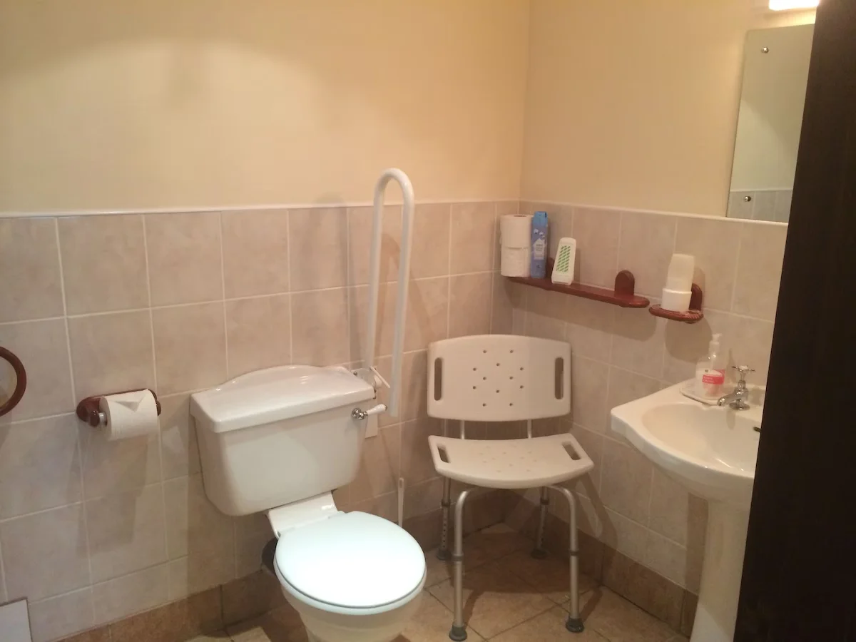 The ground floor ensuite wet room includes a step free wheel-in shower, handheld shower head, freestanding shower seat, handrails, wheel-under wash basin, and WC with transfer space on both sides. Additional bathrooms serve the upstairs bedrooms.