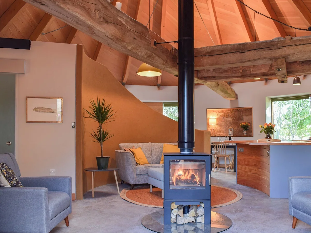 The open plan living, dining, and kitchen space is arranged on a single level with clear circulation routes throughout the circular layout.