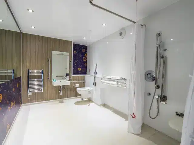 The ensuite wet room includes a fully step-free wheel-in shower, a wheel-under wash basin, supportive handrails, and a vibrating emergency alarm for additional reassurance.