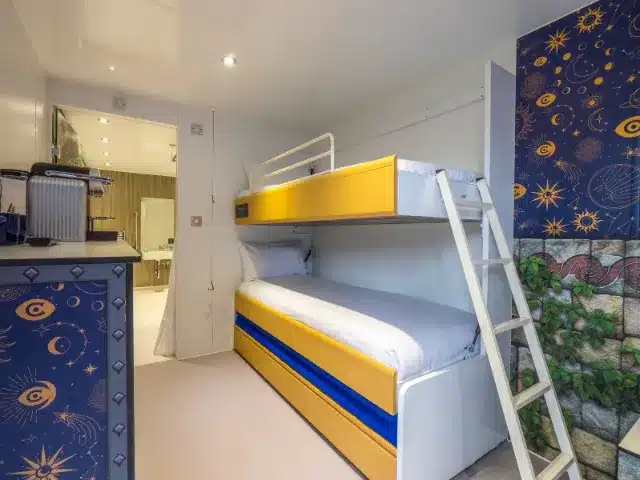 The cabin is arranged on one level with widened doorways and clear circulation space. Sleeping arrangements include a non-profiling double bed and a non-profiling single bunk bed, suitable for family stays.