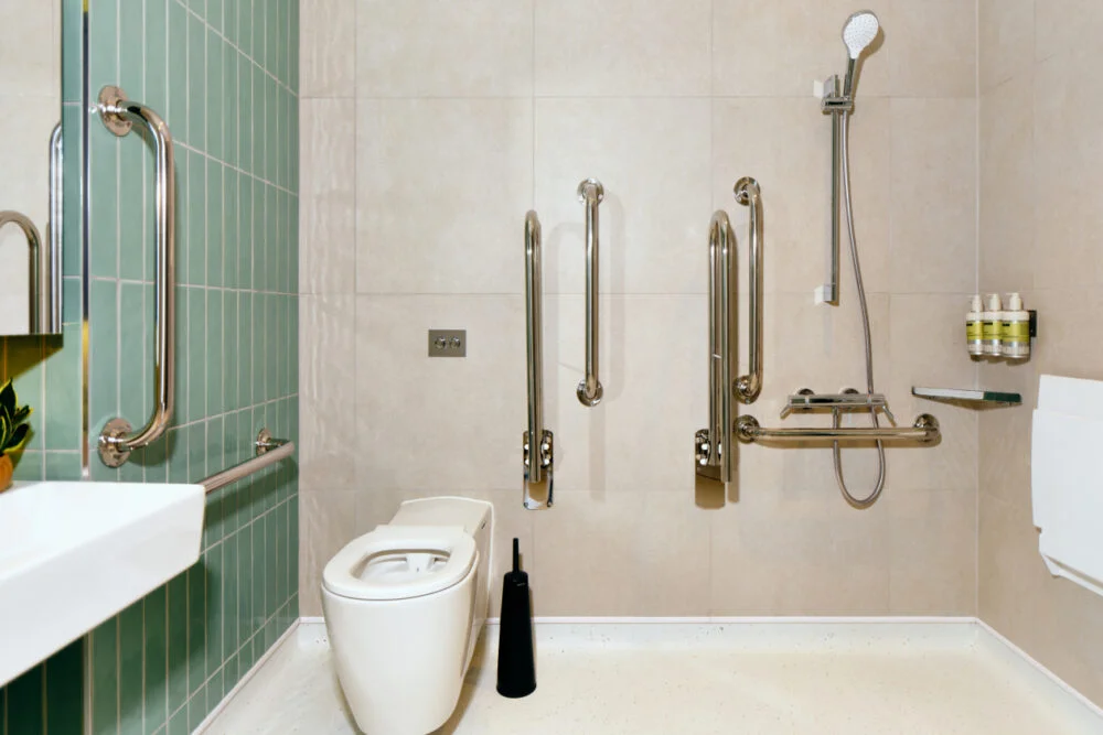 The wet room includes a step free wheel in shower, handheld shower head, fixed shower seat, supportive handrails, wheel under wash basin, and toilet with side transfer space.